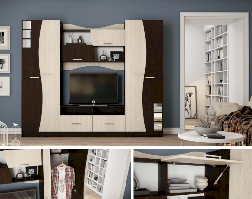 внутреннее наполнение венге/молочный дуб Гостиная «Рио» делает обстановку менее традиционной и более раскованной. Уникальный дизайн удивляет и завораживает! Оригинальное цветовое решение, несколько плавных линий и небольшие зеркальные вставки превращают самую обычную модель в центральный элемент интерьера. Безупречный внешний вид гарнитура обеспечивает ламинированное покрытие естественных оттенков с хорошо различимой текстурой натурального дерева.