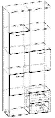 Применение задней стенки из ЛДСП (в ячейках с ящиками и фасадами) позволяет использовать данный стеллаж для зонирования пространства (чтобы предотвратить опрокидывание, необходимо обеспечить крепление стеллажа к стене).