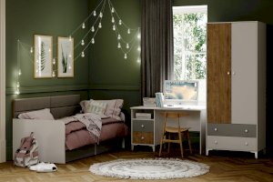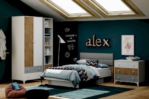 Коллекция «Морти» сочетает в себе актуальный дизайн и высокую функциональность. Практичная композиция с корпусом в древесных тонах и цветными фасадами станет отличным вариантом для меблировки современной молодежной комнаты.