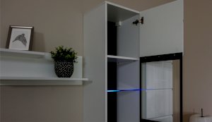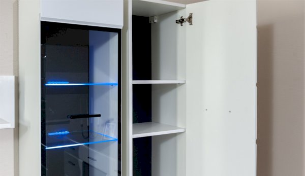 Светодиодная подсветка синего цвета для полок 2 класса Йорк подойдет к навесному пеналу-витрине 02 и комоду с витриной.