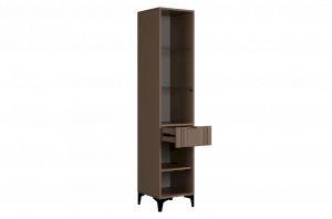 Шкаф оснащён надёжной металлической ручкой и имеет удобное внутреннее наполнение: надёжные полки за стеклянной и глухой дверцами, а также выкатной ящик. Это позволяет рационально использовать пространство.