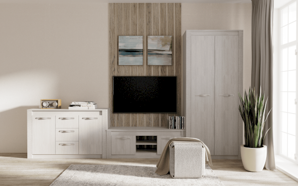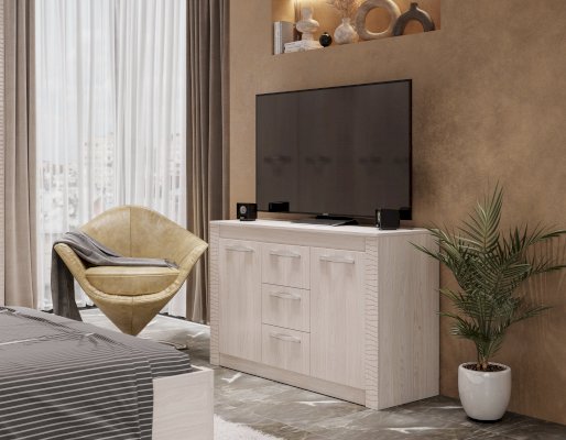Вместительный комод Монако выполнен в сдержанном и элегантном стиле, как и все модели из одноименной мебельной коллекции. Изделие изготовлено в светлом цвете белого ясеня из качественной ЛДСП и имеет декоративные вставки из МДФ. Расположить вес необходимые вещи можно в трех выдвижных ящиках, либо на полках за распашными створками.