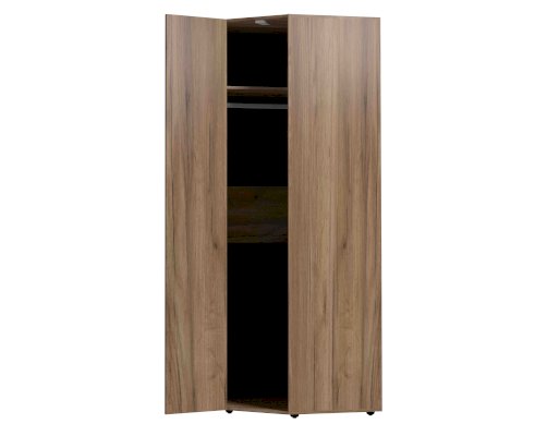 Отлично организовать пространство в маленькой спальне поможет угловой шкаф. Гладкие фасады и натуральный декор шкафа привнесут в комнату особый уют и теплоту. Стационарная штанга и полноценный стеллаж для белья внутри способствуют аккуратной организации вещей. Шкаф оснащен беспроводным светодиодным светильником, который включается при открывании двери. Это особенно удобно, если нужно найти в шкафу вещи, не потревожив близких. Легкая установка на магнитное крепление - не требует сверления, прокладывания провода, подключения к сети. Шкаф обязательно крепится к стене на подвесы, а компенсировать неровности пола можно, благодаря регулируемым опорам.